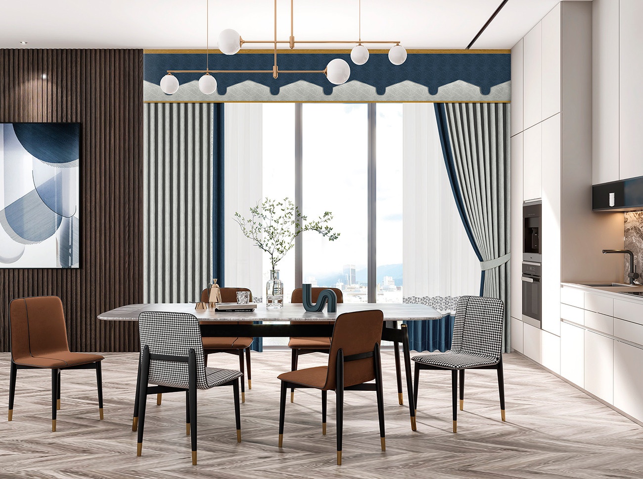 如同被海水反復(fù)沖刷打磨的鵝卵石灰,構(gòu)筑了形如城堡的抽象圖形,大理石般的優(yōu)美紋理渲染出高貴而簡(jiǎn)約的氣質(zhì)。寧?kù)o的皇室藍(lán)平靜下都市生活的喧囂,賦予空間別樣的格調(diào)與治愈力,兩者完美的層次感打破沉悶,卻不會(huì)破壞優(yōu)雅平和的氛圍。